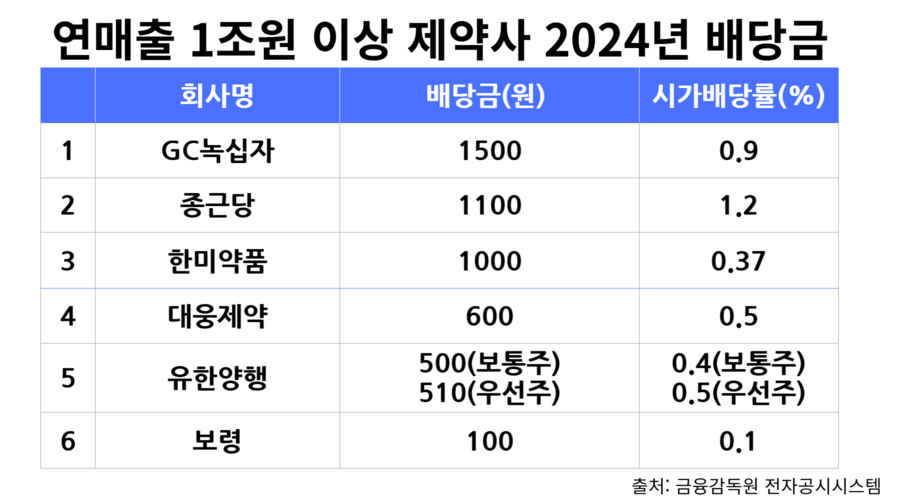 GC녹십자, 배당금 1500원 … 영업이익 줄었지만 2023년과 동일보령, 가장 적은 100원 배당 … 시가배당률도 0.1% 불과종근당, 시가배당률 1.2%로 주요 제약사 중 높은 편 업계 "영업이익 적고 신약개발 투자로 인해 배당금 적은 편"