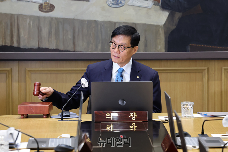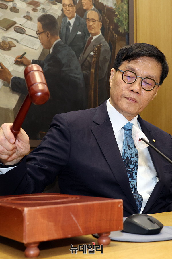 이창용 한국은행 총재가 17일 서울 중구 한국은행 본관에서 열린 금융통화위원회 본회의에서 의사봉을 두드리고 있다. (사진=공동취재단)