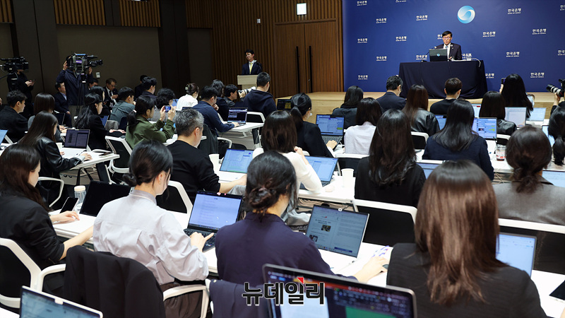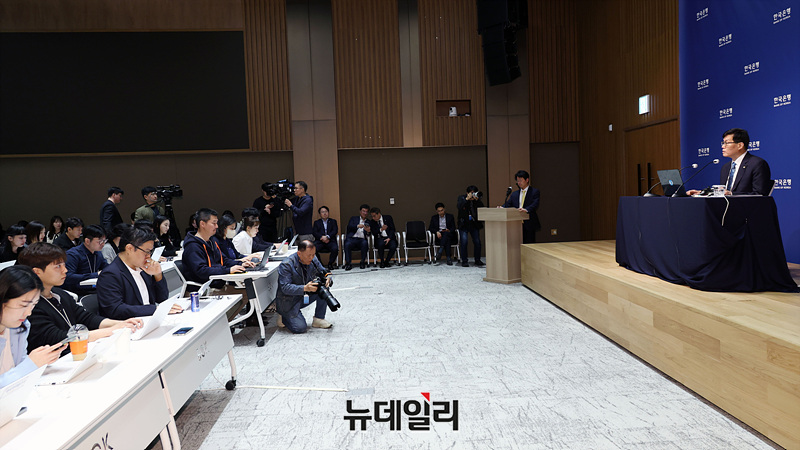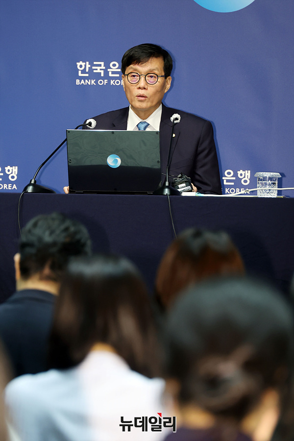 이창용 한국은행 총재가 17일 서울 중구 한국은행 본관에서 열린 금융통화위원회 본회의를 마친 후 통화정책방향 기자 간담회를 열고 취재진의 질문에 답하고 있다. (사진=공동취재단)