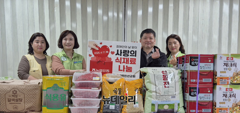 농협 하나로마트를 운영하는 농협유통(대표 이동근)은 장애인의 날을 앞둔 17일 새빛맹인선교회에 방문해 식재료를 기부했다. 농협유통은 시각장애인분들이 거주하는 새빛맹인선교회를 찾아 건강에 도움이 되는 고기와 잡곡 등을 기부했다. (사진=농협유통)
