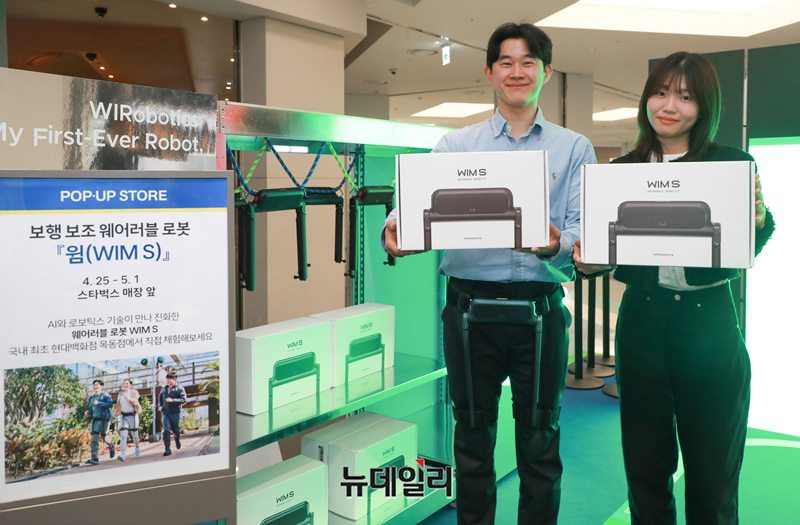 현대백화점이 5월 1일까지 목동점 지하 2층에서 위로보틱스의 신제품 '윔 에스(WIM S)' 출시 기념 팝업스토어를 진행한다.'윔 에스'는 보행보조 웨어러블 로봇으로 약 1.6kg의 초경량 무게와 인체공학적 디자인이 특징이다.이번 팝업에는 제품 판매와 함께 다양한 이벤트를 준비했다. 팝업 방문 고객에게는 위로보틱스 스티커를 증정하고, 윔 에스를 체험한 고객에게 트라이탄 소재의 '데일리 밸런스 보틀(550ml)'을 선착순으로 제공한다.또 행사 기간 제품을 구매한 고객에게는 전용 서스펜더와 현대백화점 상품권을 증정할 예정이다. (사진=현대백화점)