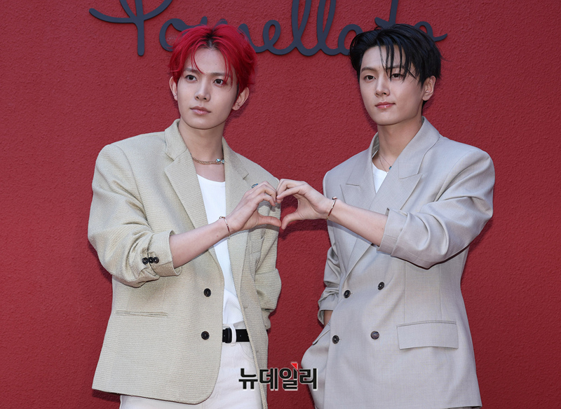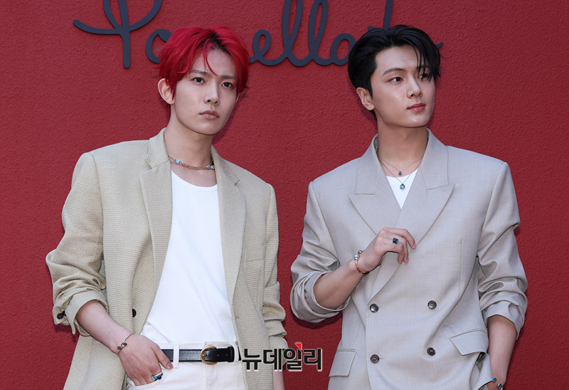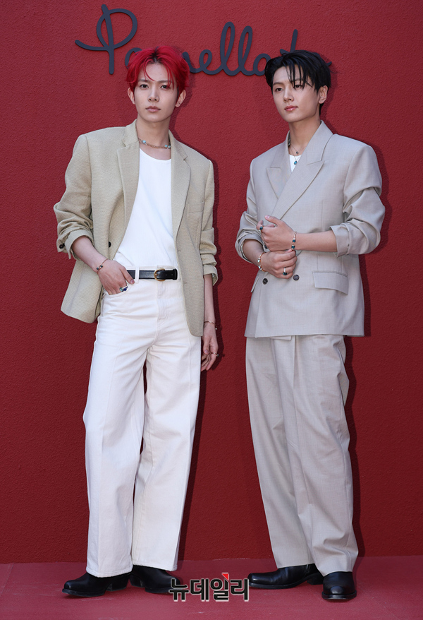 엔하이픈 희승과 제이가 30일 오후 서울 성동구 연무장길에 오픈한 포멜라토 팝업 부티크에서 열린 누도 컬렉션 기념 행사에서 포즈를 취하고 있다.
