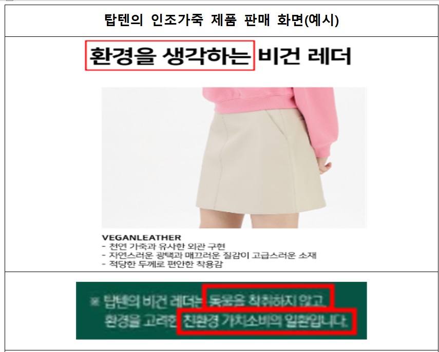 신성통상은 자사 브랜드 탑텐(TOPTEN)의 폴리에스터, 폴리우레탄 등 석유화학 원단으로 이루어진 인조가죽 제품을 지난해 1월부터 올해 2월까지 자사 홈페이지 및 네이버 스토어, 무신사 등 의류 판매 플랫폼 등에서 판매했다.제품 판매 페이지 상품명에는 '에코 레더' 등 친환경적 표현을 포함해 광고하고, 상품 설명란에는 '환경을 생각하는', '에코 레더', '지속가능성을 고려한', '친환경 가치소비', '친환경 소재' 등 친환경적인 표현을 사용해 광고했다.이랜드월드는 자사 브랜드 미쏘(MIXXO)와 스파오(SPAO)의 폴리에스터, 폴리우레탄 등 석유화학 원단으로 이루어진 인조가죽 제품을 2021년 8월부터 지난해 12월까지 자사 홈페이지에서 판매했다.