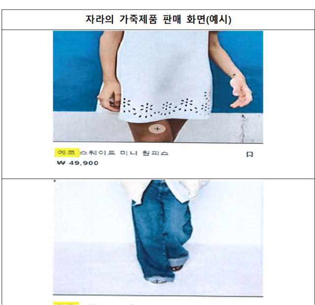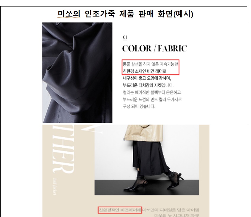 미쏘는 상품명에 '에코 퍼', '에코 레더', '에코 스웨이드'를 친환경적 표현을 포함해 광고했고, 상품 설명란에는 '지속가능한', '친환경 소재', 'ECO LEATHER 100%', 'ECO VEGAN LEATHER'등 광고 표현과 친환경 마크를 표시했다. 스파오는 상품명에 '에코 레더', '에코 스웨이드' 등 친환경적인 표현을 포함해 제품을 광고했다.아이티엑스코리아는 자사 브랜드 자라(ZARA)의 폴리에스터, 폴리우레탄, 비스코스 등으로 이루어진 인조가죽 제품과 양가죽, 소가죽 등 동물가죽 제품을 2020년 2월부터 지난해 8월까지 자사 홈페이지에서 판매하며, 제품 판매 페이지 상품명에 '에코 레더', '에코 시어링', '에코 스웨이드', '에코 퍼' 등 친환경적 표현을 사용해 광고했다.공정위는 이들 4개 업체들이 자체적으로 원단을 생산하지 않고 이미 제작된 원단을 해외에서 매입해 제품을 생산했고, 이에 대해 특별히 친환경적인 공정을 주문했다거나 거쳤다고 볼 수 없다고 지적했다. 4개 업체들은 공정위가 조사를 시작하자 문제의 광고를 자진시정하고 제품 판매 중단했다.공정위의 "공정위는 앞으로도 그린워싱 및 온라인 플랫폼 시장에서의 부당한 표시·광고 행위를 지속적으로 감시하고 적발 시에는 엄중하게 대응해 나갈 계획"이라고 밝혔다.
