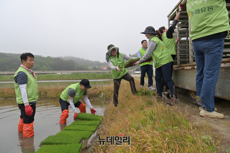 농협 하나로마트를 운영하는 농협유통(대표이사 이동근) 임직원 30여 명은 15일 충남 당진시 대호지농협 관내 농가에 방문해 모판 나르기와 마늘쫑 뽑기 등 일손을 돕기를 진행했다.