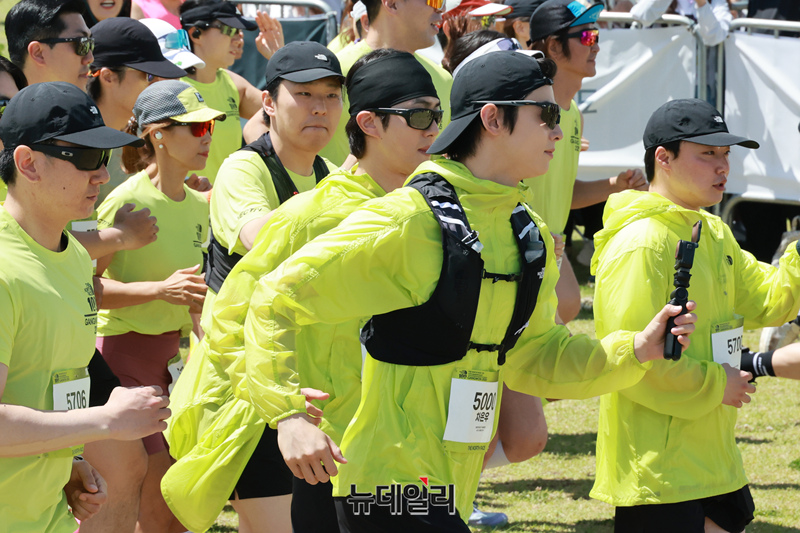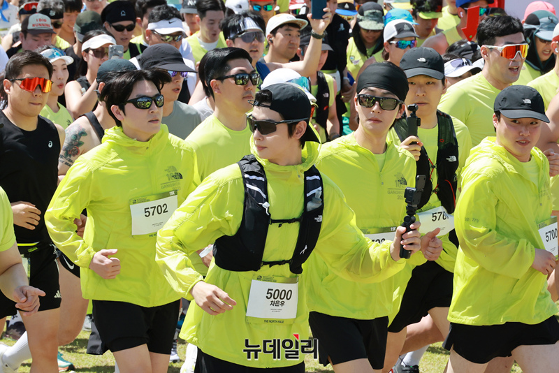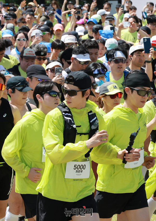 노스페이스 홍보대사 차은우가 17일 오후 강원 강릉시 경포호수공원에서 진행되는 '2025 TNF100 강원' 행사에서 참석자들과 함께 런닝하고 있다.영원아웃도어(대표 성기학)의 글로벌 아웃도어 브랜드 노스페이스가 개최하는 '2025 TNF100 강원'은 한국을 비롯해 중국, 일본, 대만, 홍콩, 태국, 호주, 싱가포르 등에서 열리는 글로벌 트레일러닝 대회다.10km, 50km, 100km 등 3개 부문으로 나눠 약 2,000여 명의 국내외 선수들이 참가해 강릉 일대에서 진행된다. (강원 강릉=이종현 기자)