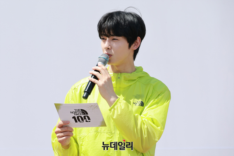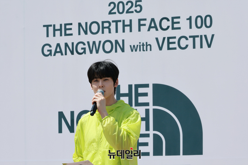 노스페이스 홍보대사 차은우가 17일 오후 강원 강릉시 경포호수공원에서 진행되는 '2025 TNF100 강원' 행사에서 인사말을 하고 있다.영원아웃도어(대표 성기학)의 글로벌 아웃도어 브랜드 노스페이스가 개최하는 '2025 TNF100 강원'은 한국을 비롯해 중국, 일본, 대만, 홍콩, 태국, 호주, 싱가포르 등에서 열리는 글로벌 트레일러닝 대회다.10km, 50km, 100km 등 3개 부문으로 나눠 약 2,000여 명의 국내외 선수들이 참가해 강릉 일대에서 진행된다. (강원 강릉=이종현 기자)
