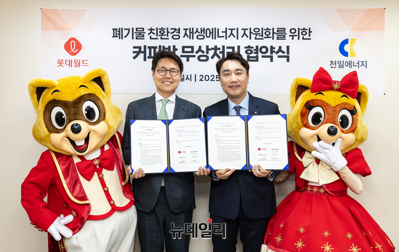 롯데월드는 ㈜천일에너지와 27일 사업장에서 발생하는 커피박을 친환경 재생에너지 자원으로 전환하는 업무협약을 체결했다.이번 협약으로 롯데월드는 롯데월드 어드벤처 및 단지 내 관리시설에서 발생하는 연간 약 40톤의 커피박을 음식폐기물로 처리하는 대신, 재활용 원료로 활용할 수 있을 것으로 기대한다.수거된 커피박은 추후 재생 비닐 제품으로 가공되며, 해당 제품들이 롯데월드 어드벤처에 재납품 될 예정이다. 향후에도 롯데월드는 천일에너지의 설비를 활용한 각종 폐기물들의 효과적인 재활용 방안을 추가 검토할 계획이다.롯데월드는 2021년 ESG 경영선포식을 한 이후, 기후변화 대응 및 자원관리, 해양생태계 보전 등 ‘Green World(그린월드)’ 환경 비전을 달성하기 위한 주요 과제들을 수립하고 환경 경영 성과를 만들고 있다. (사진=롯데월드)