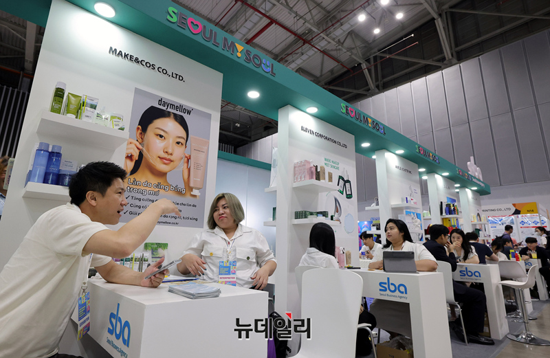 5일 베트남 호치민 SECC전시장에서 한국무역협회 주관 코엑스 주최로 열린 2025 베트남 국제 프리미엄 소비재전(VIPREMIUM) 서울경제진흥원 부스에서 현지 인플러언서가 상품을 소개하는 라이브 방송을 하고 있다.