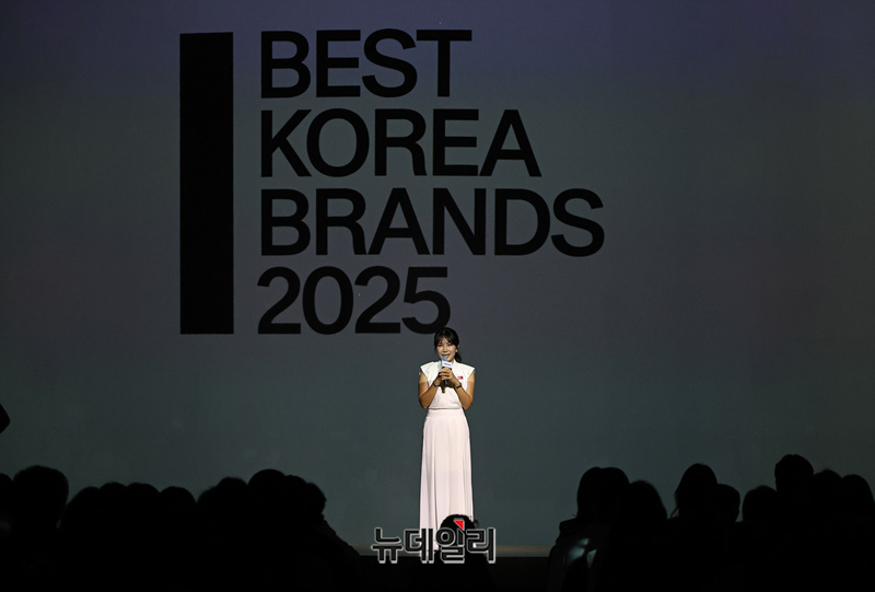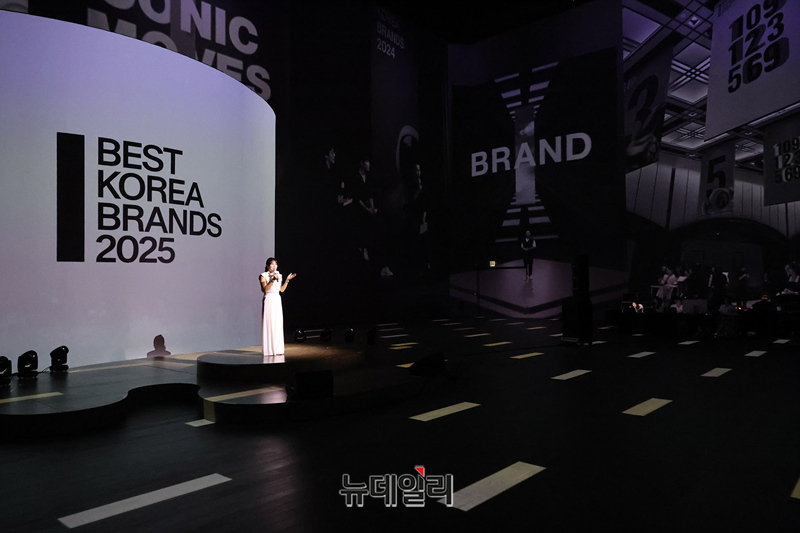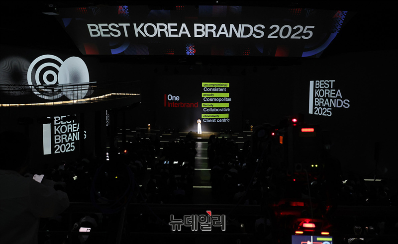 황유진 인터브랜드 글로벌 클라이언트 파트너가 17일 오후 서울 광진구 그랜드 워커힐 서울 빛의시어터에서 열린 '2025년 베스트 코리아 브랜드'에서 강연을 하고 있다.