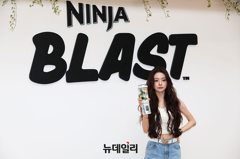 유튜버 프리지아가 20일 오후 서울 강남구 꼴라보하우스에서 열린 프리미엄 가전 브랜드 '샤크닌자'의 닌자 블라스트 팝업 포토월에서 포즈를 취하고 있다.