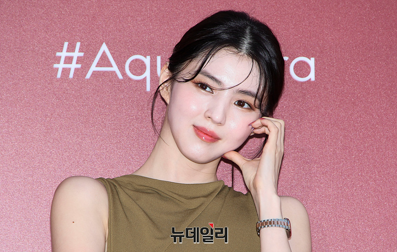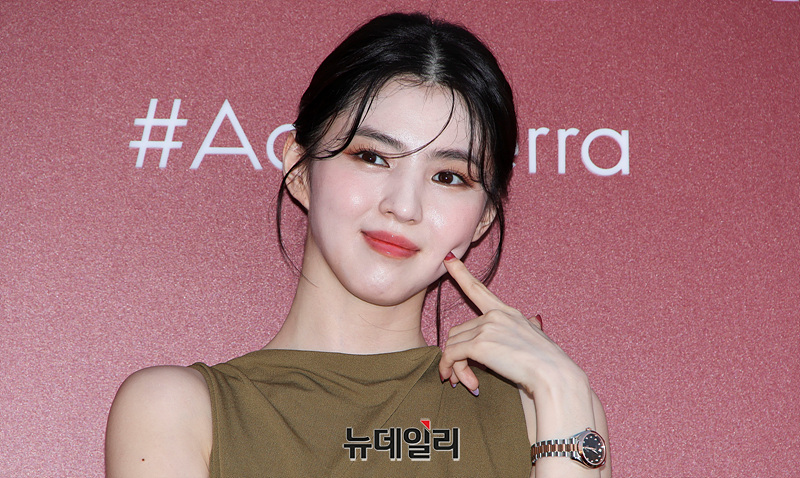 배우 한소희가 23일 오후 서울 강남구 레스토랑 본연에서 열린 스위스 럭셔리 워치 브랜드 오메가(OMEGA)의 '시마스터 아쿠아 테라 30mm' 출시 기념 행사 포토월에서 포즈를 취하고 있다.
