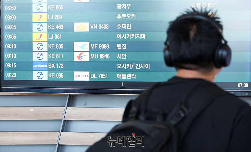 인천국제공항 제1터미널에서 운항하던 에어부산이 제2여객터미널로 이전한 29일 오전 제2여객터미널 출발층 전광판에 에어부산 항공편 정보가 송출되고 있다.