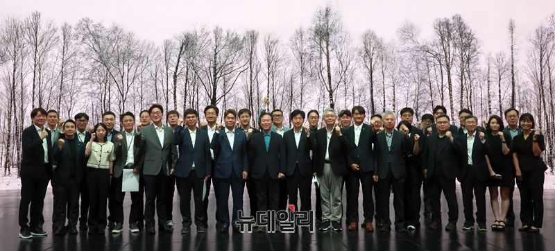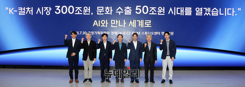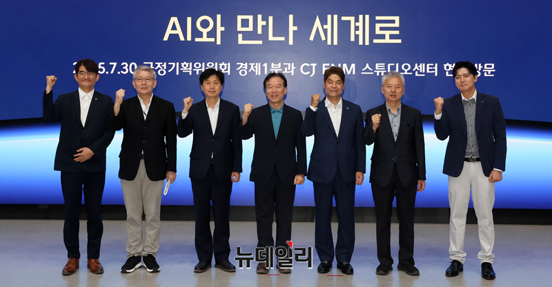 정태호 국정기획위원회 경제1분과장(왼쪽 네번째)과 허민회 CJ 경영지원대표(왼쪽 다섯번째), 윤상현 CJ ENM대표(오른쪽)를 비롯한 위원들이 30일 경기 파주시 탄현면 CJ ENM 스튜디오를 찾아 기념촬영을 하고 있다. 2025.07.30 사진공동취재단