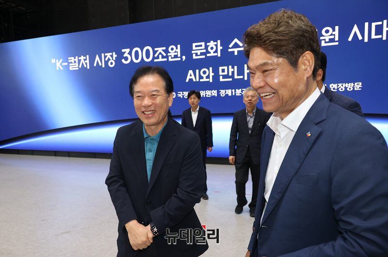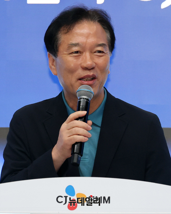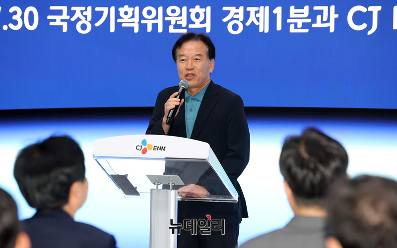 국정기획위 경제1분과 정태호 분과장이 30일 오전 경기 파주시 CJ ENM 스튜디오를 방문해 인사말을 하고 있다. 2025.7.30 사진공동취재단