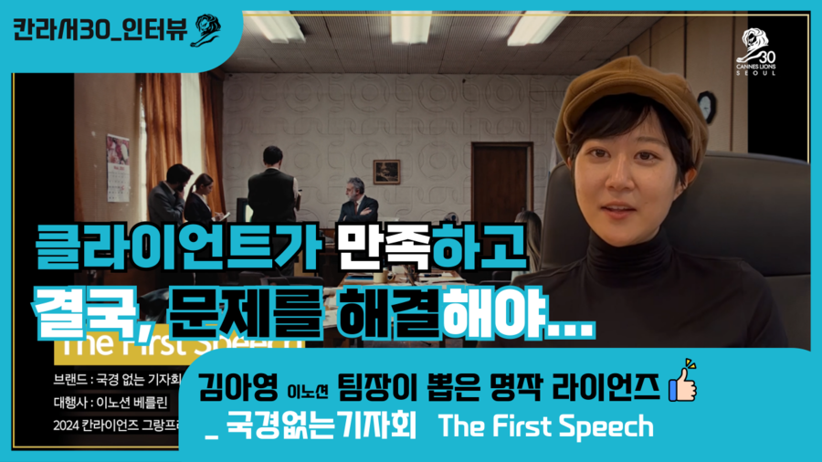 [편집자 주] 올해로 30주년을 맞은 칸라이언즈서울(이하 칸라서) 페스티벌은 한국의 크리에이티비티 산업과 세계를 잇는 가교이자, 광고·마케팅·브랜드 분야 크리에이터들의 도전과 영감을 응원하는 국내 대표 플랫폼으로 자리잡았습니다. 그 역사와 의미를 되새기며, 브랜드와 사회를 더 나은 방향으로 이끄는 '크리에이티비티의 힘'을 다시 한번 조명해보고자 합니다. 이에 브랜드브리프는 칸라서 30주년을 기념해 한국 광고계를 대표하는 크리에이티브 리더 37인의 인터뷰를 진행합니다. 각자의 자리에서 세상을 변화시켜온 이들의 깊이있는 통찰을 통해, 우리가 나아가고자 하는 크리에이티비티의 방향을 함께 고민합니다.김아영 이노션 팀장2019 영라이언즈컴피티션 미디어 실버 수상2019 칸라이언즈서울 스피커김아영 팀장이 뽑은 명작 라이언즈2024 칸라이언즈 그랑프리 포 굿브랜드 : 국경 없는 기자회(Reporters Without Borders)캠페인 : The First Speech대행사 : 이노션 베를린"독재자들의 첫 연설을 통해 언론 자유의 중요성을 굉장히 재미있고 흥미롭게 인상적으로 일깨워 준 캠페인"크리에이티브에게 칸라이언즈란?"어른으로서 상 탈 일이 많지 않은데, 이 엄청난 플랫폼을 통해서 세계의 많은 사람들이 업계를 초월해서 함께 크리에이티비티를 축하하고 서로 영감을 주고받을 수 있는 놀이터라는 점에서 특별한 곳입니다. 어쩌면 칸이 가장 크리에이티브한 브랜드 아닐까요."'좋은 크리에이티브'란?"먼저 클라이언트가 만족해야 하고, 나아가 사람들의 인식이나 행동을 변화시켜서 어떤 문제를 해결할 수 있는 희망을 주는 것이 좋은 크리에이티브라고 생각합니다."칸라서30을 축하하며"지난 30년간 한국의 크리에이티브 산업을 이끌어 오신 모든 분들의 노력과 열정에 깊은 감사를 드리고 앞으로도 다음 30년 또한 기대하겠습니다. 계속해서 저희 모두에게 영감을 주시길 바랍니다."한편, 칸라서30 페스티벌은 오는 9월 24일부터 26일까지 광화문 씨네큐브에서 열린다. 올해 칸라이언즈 수상작과 세미나 하이라이트를 비롯해 광고, 마케팅, 브랜딩, 디자인, 기술 등 다양한 분야를 대표하는 글로벌 전문가들이 연사로 무대에 올라 최신 트렌드와 성공 사례를 공유하고 크리에이티브한 인사이트를 나눌 예정이다.[칸라서30 인터뷰 싣는 순서] 김정아 이노션 CCO - 황성필 제일기획 CD - 양수희 퍼블리시스그룹 코리아 CCO - 김낙회 아시아광고연맹(AFAA) 부회장 - 최인아 최인아책방 대표 - 오형균 맥켄코리아 ECD - 신석진 크래프톤 부사장 - 김현 대홍기획 아트디렉터 - 김장한 디마이너스원 공동 대표 - 지로 하야시 덴츠 ECD - 차수연 틱톡 크리에이티브 스트래터지스트 - 강승리 제일기획 프로 - 김아영 이노션 팀장