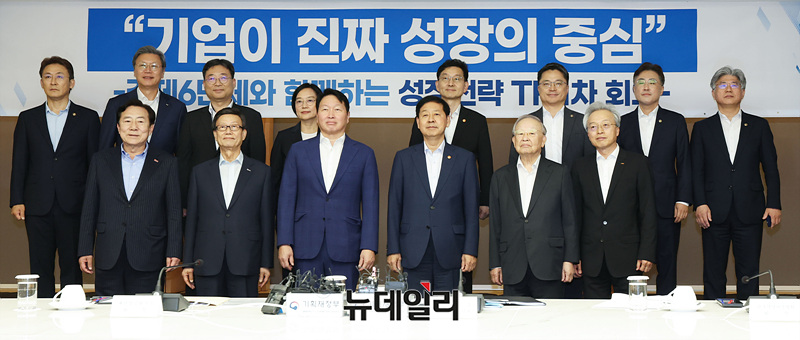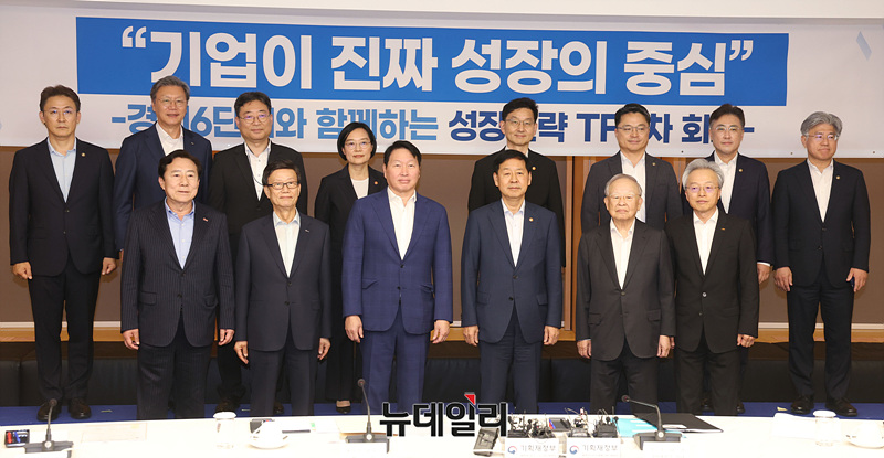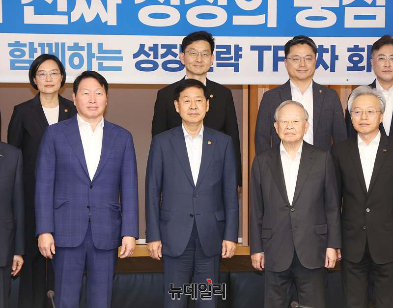 구윤철 부총리 겸 기획재정부 장관과 최태원 대한상공회의소 회장, 손경식 경총 회장, 윤진식 무협 회장, 김기문 중기중앙회 회장, 최진식 중견견 회장, 김창범 한경협 부회장, 한성숙 중기부 장관, 한기정 공정거래위원장, 권대영 금융위 부위원장, 문신학 산업부 1차관, 이진수 법무부 차관, 하준경 경제성장수석비서관 등 참석자들이 5일 오후 서울 중구 대한상공회의소에서 열린 '성장전략 TF 1차 회의'에서 기념촬영을 하고 있다.