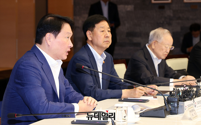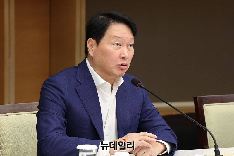 최태원 대한상공회의소 회장이 5일 오후 서울 중구 대한상공회의소에서 열린 '성장전략 TF 1차 회의'에서 모두발언을 하고 있다.