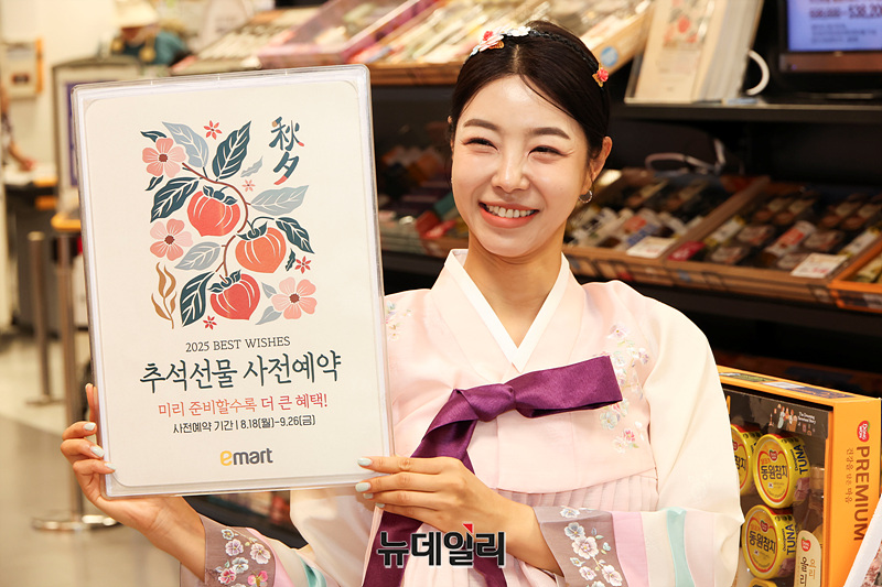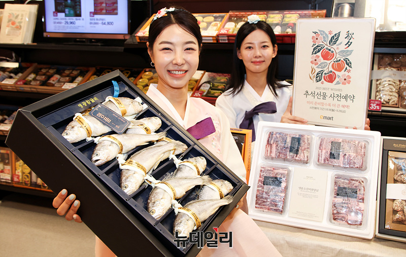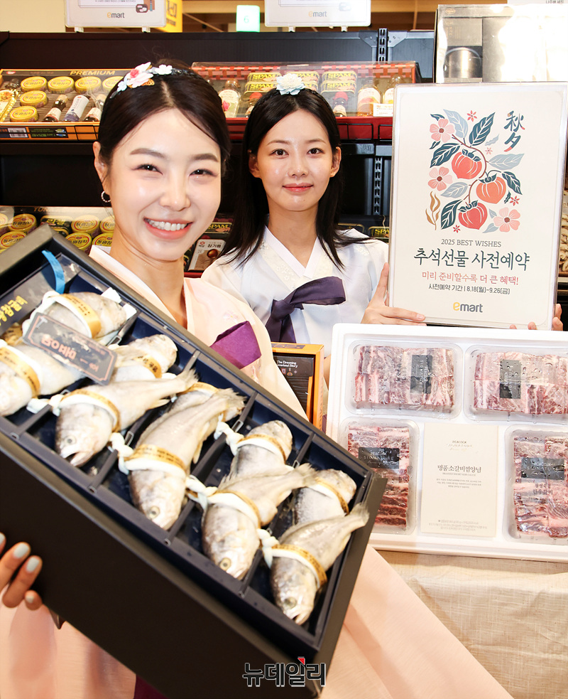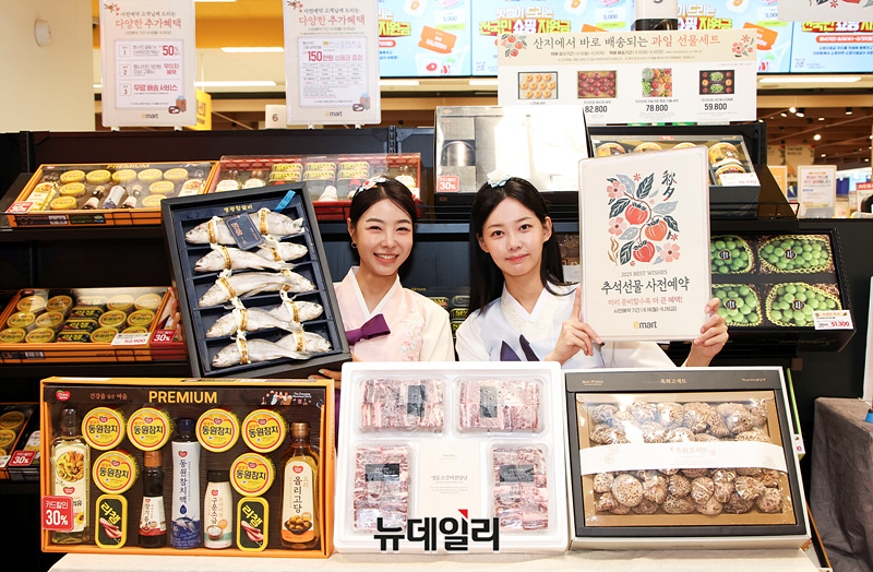 이마트가 19일 오전 서울 용산점에서 추석 선물세트 사전예약 프로모션을 알리고 있다.9월 26일까지 행사카드로 선물세트를 구매하면 상품별로 최대 50% 할인하는 프로모션을 진행한다.구매 금액대별로 최대 150만원의 신세계상품권을 증정한다. 이마트 춱 선물세트는 SSG닷컴 이마트몰에서도 구매 가능하다.세트 구성은 고물가 흐름을 반영해 '실속'에 초점을 맞췄다. 과일의 경우 합리적 가격대의 3~4만원대 사전예약 물량을 전년보다 20% 확대했다.한우 세트는 특색 있는 가성비 세트를 새롭게 출시하면서도 기존 주력 상품은 가격 방어에 힘썼다. 대표적으로 '피코크 한우 갈비살 모둠구이 세트(냉동, 갈비살/살비본살 각 400gx2)'를 신규 기획해 행사가 198,400원에 판매한다.이외에도 수산 선물세트, 가공식품 선물세트 등 다양한 상품을 최대 반값에 판매한다.