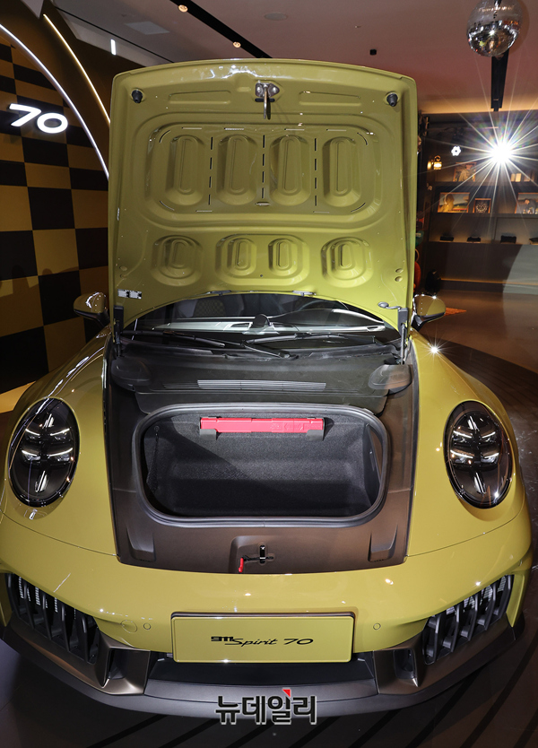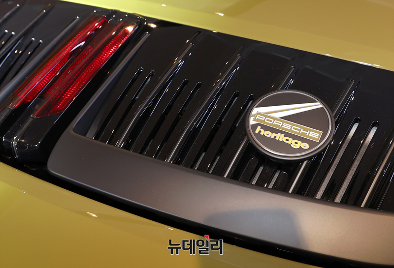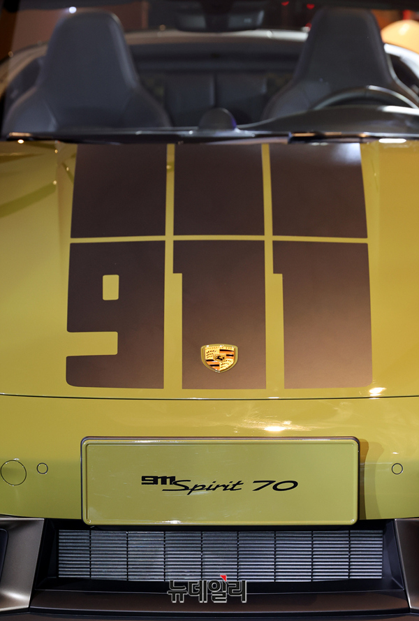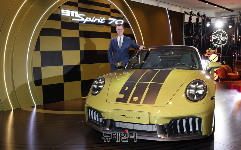 마티아스 부세 포르쉐코리아 대표가 27일 오전 서울 강남구 포르쉐 스튜디오 청담에서 열린 프리뷰 행사에서 '신형 911 스피릿 70'을 국내 최초로 공개하고 있다. 1970년대의 감성을 반영한 '신형 911 스피릿 70'은 모던한 감성이 돋보이는 익스클루시브 올리브 네오 (Olive Neo) 컬러, 헤리티지 모델에서 영감을 얻은 그래픽 장식, 그리고 전설적인 파샤 패턴 인테리어가 특징이다.전 세계 1,500대 한정 생산되는 컨버터블 모델. 올해 10월 국내 출시 예정이다. 판매 가격은 부가세를 포함해 3억 2,600만 원부터 시작된다.