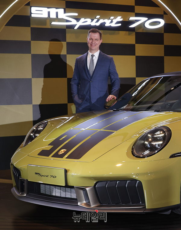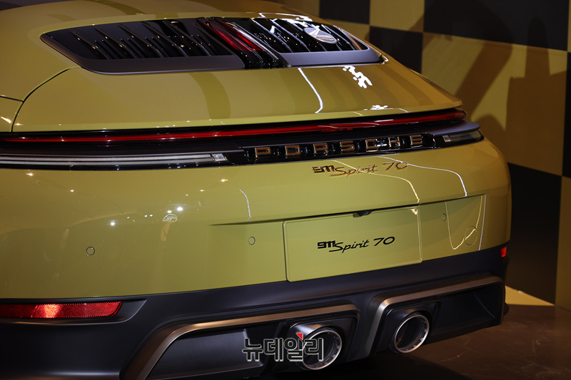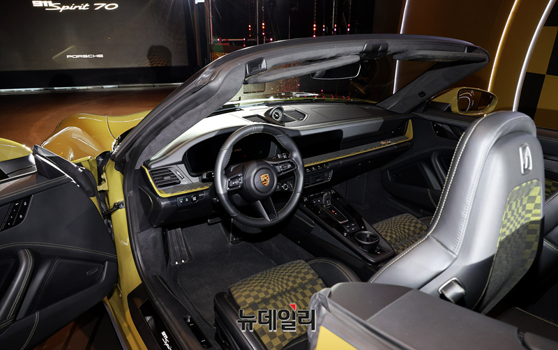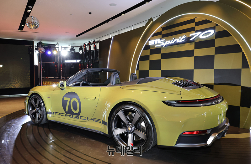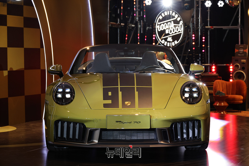 포르쉐코리아가 27일 오전 서울 강남구 포르쉐 스튜디오 청담에서 열린 프리뷰 행사에서 '신형 911 스피릿 70'을 국내 최초로 공개하고 있다. 1970년대의 감성을 반영한 '신형 911 스피릿 70'은 모던한 감성이 돋보이는 익스클루시브 올리브 네오 (Olive Neo) 컬러, 헤리티지 모델에서 영감을 얻은 그래픽 장식, 그리고 전설적인 파샤 패턴 인테리어가 특징이다.전 세계 1,500대 한정 생산되는 컨버터블 모델. 올해 10월 국내 출시 예정이다. 판매 가격은 부가세를 포함해 3억 2,600만 원부터 시작된다.