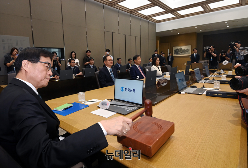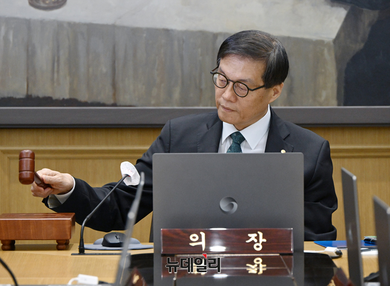 이창용 한국은행 총재가 28일 오전 서울 중구 한국은행에서 열린 금융통화위원회에서 의사봉을 두드리고 있다. (사진=공동취재단)