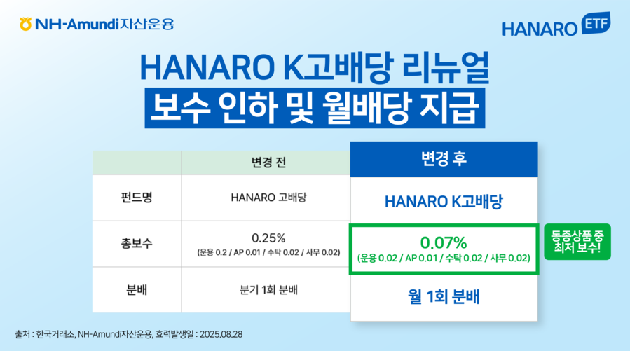 NH-Amundi자산운용은 'HANARO 고배당'을 'HANARO K고배당'으로 상품 명칭을 바꾸고 총보수를 0.07%로 낮췄다고 28일 밝혔다.HANARO K고배당 ETF는 지난 2019년 상장된 국내 고배당주에 투자하는 펀드다. NH-Amundi자산운용은 국내 주식에 집중투자하는 ETF라는 것을 투자자들이 직관적으로 알 수 있도록 기존 HANARO 고배당에서 명칭을 바꿨다.기초지수는 'FnGuide K고배당 지수'다. 해당 지수는 코스피·코스닥 상장 종목 가운데 3년 이상 연속 배당을 실시하고 배당 규모가 줄어들지 않은 기업 중 배당수익률이 가장 높은 40개 종목으로 구성된다.이처럼 배당 지속성 및 성장 가능성이 높은 종목에 투자하고 있어 상장 이후 매년 분배금도 꾸준히 늘었다. 연간 분배금은 ▲2020년 365원 ▲2021년 400원 ▲2022년 505원 ▲2023년 525원 ▲2024년 555원 ▲2025년(1~7월 누적) 650원으로 증가하며 매년 상승 추세를 이어가고 있다.명칭 변경과 함께 보수 인하도 단행했다. 회사는 투자자들의 장기 투자 시 비용 효율성이 높아질 수 있도록 총보수를 기존 0.25%에서 0.07%로 인하했다. 이는 국내 주식형 고배당 ETF 중 최저 수준이다.아울러 분배주기도 기존 분기 단위에서 월 단위로 전환한다. 투자자들은 매달 꾸준한 현금흐름을 기대할 수 있게 됐다.최근 상법 개정과 배당세제 개편 등 제도적 변화로 기업의 주주환원 정책 강화가 이어지고 있다. 이에 고배당 종목에 대한 투자 매력은 한층 부각되고 있다. HANARO K고배당 ETF는 투자자의 비용 부담을 낮추면서 퇴직연금 등 장기 투자 수단으로서의 활용도가 더욱 높아질 전망이다.김승철 ETF투자본부장은 "최근 정부의 자본시장 선진화 정책으로 국내 배당주 투자 환경이 크게 개선되고 있다"라며 "HANARO K고배당 ETF는 배당수익률뿐만 아니라 배당 성장성과 지속성까지 고려한 상품으로 이번 보수 인하를 계기로 장기 투자 수단으로서의 매력이 더욱 높아질 것으로 기대한다"라고 말했다.
