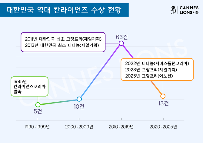 - 칸라이언즈코리아가 걸어온 30년의 역사는 K-크리에이티비티의 눈부신 성장과 함께 한다. 1995년 발족 이후 5년간(1995년부터 1999년까지) 2개에 불과했던 칸라이언즈(정식 명칭 : Canneslions International Festival of Creativity, 이하 칸라이언즈) 어워드 수상작은 최근 5년간(2021년부터 2025년까지) 13개로 뛰어올랐다.