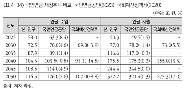국민연금 지출이 오는 2050년에는 수입의 2.8배 수준으로 불어날 것이라는 국책연구기관의 전망이 나왔다.한국보건사회연구원은 2일 '사회보장 장기 재정추계 통합모형 구축' 보고서를 통해 국민연금 총수입이 올해 58조원에서 2050년 116조5000억원으로 늘어날 것으로 예상했다.같은 기간 총지출은 50조3천억원에서 322조2천억원(수입의 2.8배)으로 늘어날 것으로 연구진은 내다봤다.올해는 수입이 지출보다 7조7000억 원 많지만 2050년에는 지출이 수입의 2.8배로 늘어나면서 205조7000억원 손실이 발생하는 셈이다.2025년 적자 규모에 대해 국회예산정책처는 지난 2020년 168조3000억원으로 추산했고, 국민연금공단은 2023년 195조4000억원으로 각각 추산한 바 있다.연구진은 올해 2194만명인 국민연금 가입자가 저출생 영향으로 2050년엔 1549만명까지 큰 폭으로 감소할 것으로 내다봤다.반면 수급자(노령·장애·유족연금 포괄)는 올해 753만5000명에서 2050년 1692만5000명으로 늘어난다는 봤다.2050년이면 건강보험도 44조6000억원 규모 적자를 예고했다. 건강보험 총수익은 올해 106조1000억원에서 2050년 251조8000억원으로 늘지만, 같은 기간 총지출은 105조2000억원에서 296조4000억원으로 증가할 것으로 예상됐다.건보료와 통합 징수하는 노인장기요양보험 역시 수입은 2025년 18조7000억원에서 2050년 90조9000억원으로 늘어날 것으로 보인다.같은기간 지출은 16조4000억원에서 138조2000억원으로 치솟을 것으로 연구진은 내다봤다.고령화에 따라 사회보험뿐 아니라 일반 재정사업 소요도 늘어날 것으로 예상된다.65세 이상 노인 중 소득인정액 하위 70%에게 지급되는 기초연금 재정 소요는 연금액이 소비자 물가 상승률만큼만 오른다고 가정했을 때 2025년 26조1000억원에서 2050년 66조6000억원으로 치솟는다.기초생활보장을 위해 저소득층에게 지원하는 생계급여 재정(국비+지방비)도 2025년 11조5000억원에서 2050년 22조4000억원으로, 의료급여 부담금(국비+지방비)은 13조5000억원에서 63조9000억원으로 늘어날 것으로 예상됐다.연구진은 "베이비부머 세대의 고령화로 인해 사회적 지원과 돌봄이 요구되는 고령인구가 압도적 규모로 증가하게 된다"며 "사회보장 분야를 구성하는 사회보험과 일반재정 모두 미래 재정 여건이 심각하게 나빠질 수 있다"고 경고했다.
