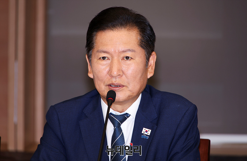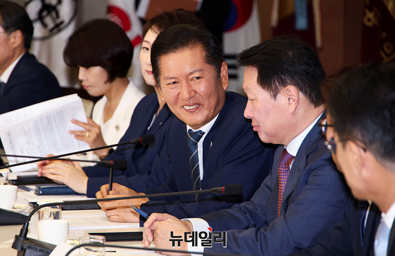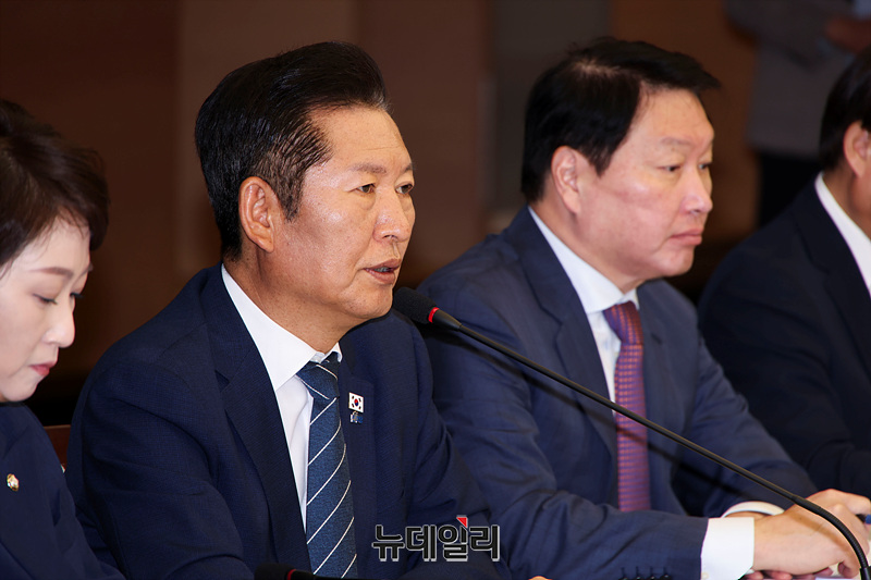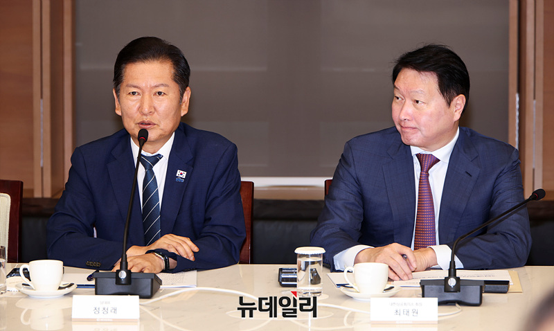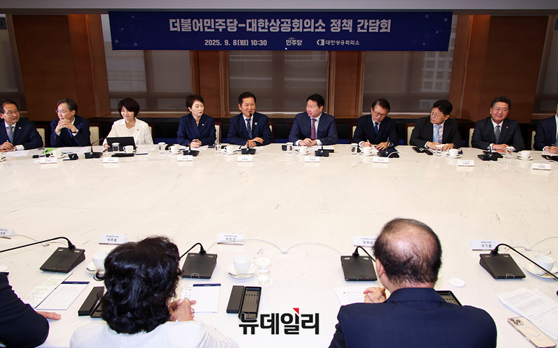 정청래 더불어민주당 대표가 8일 오전 서울 중구 대한상공회의소에서 열린 '더불어민주당-대한상공회의소 정책간담회'에서 모두발언을 하고 있다.