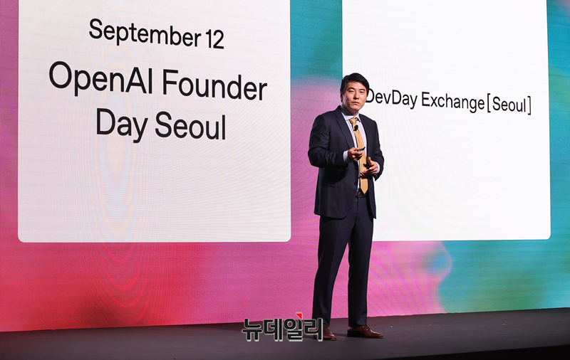 제이슨 권(Jason Kwon) OpenAI(오픈에이아이) 최고전략책임자(CSO)가 10일 오전 서울 광진구 파이팩토리에서 열린 오픈AI 서울사무소 개소 간담회에서 비전 발표를 하고 있다.