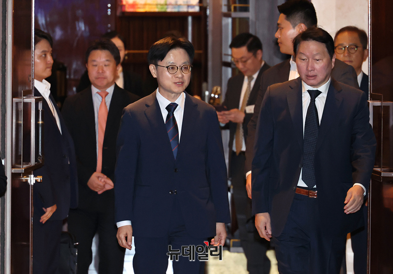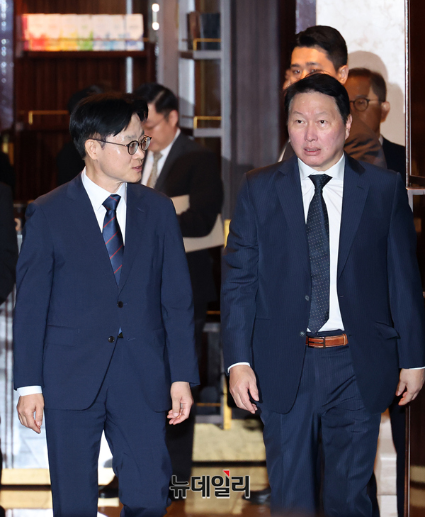 김정관 산업통상자원부 장관과 최태원 대한상공회의소 회장이 10일 오후 서울 중구 웨스틴조선 호텔에서 열린 제조AX 얼라이언스 출범식에 입장하고 있다.