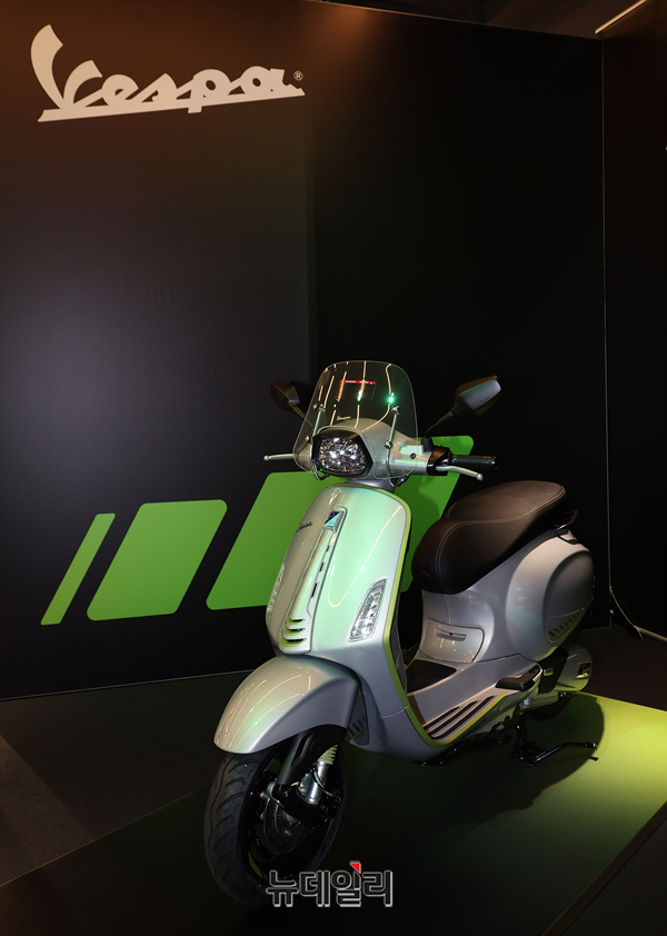 이탈리아 아이코닉 모터사이클 브랜드 베스파가 12일 오전 서울 강남구 베스파 모토플렉스 서울점에서 신모델을 선보이고 있다.