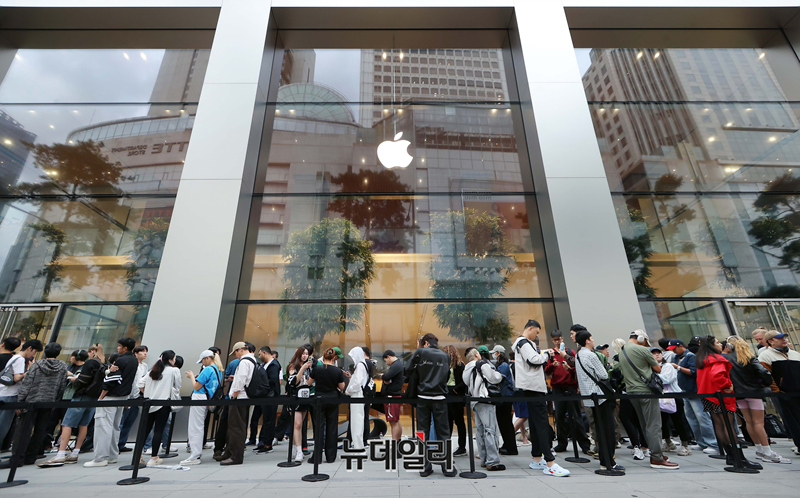 아이폰17 시리즈가 공개된 19일 오전 서울 중구 Apple 명동 스토어에서 매장을 찾은 시민들이 매장 오픈전 입장을 위해 줄을 서 있다.이날 Apple은 가장 얇은 iPhone Air를 비롯해 새로운 iPhone 17, iPhone 17 Pro, iPhone 17 Pro Max와 새로운 Apple Watch 시리즈인 Apple Watch Series 11, Apple Watch Ultra 3, Apple Watch SE3, AirPods Pro 3 등의 신제품을 정식 발매한다. (사진=애플코리아)
