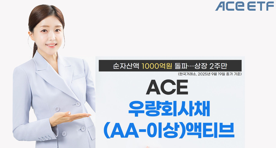 한국투자신탁운용은 ACE 우량회사채(AA-이상)액티브 상장지수펀드(ETF) 순자산액이 1000억원을 돌파했다고 22일 밝혔다.한국거래소에 따르면 19일 기준 ACE 우량회사채(AA-이상)액티브 ETF의 순자산액은 1051억원으로 집계됐다. 상장한 이후 약 2주 만에 순자산액이 2배 증가했다. ETF 상장 당시 신탁원본액은 500억원이다.ACE 우량회사채(AA-이상)액티브 ETF는 신용등급 AA- 이상의 회사채와 중단기 기타금융채 등에 투자하는 상품이다. 비교지수는 KIS자산평가가 산출·발표하는 'KIS 1~3년 우량크레딧(AA-이상) 총수익지수'이다. 해당 지수는 ▲발행잔액 500억원 이상 ▲신용등급 AA- 이상 ▲잔존만기 1년 초과 3년 이하의 여전채 및 회사채 종목으로 구성됐다.자금 유입은 검증된 운용 이력(트랙 레코드) 덕분으로 풀이된다. ACE 우량회사채(AA-이상)액티브 ETF는 국내채권형 펀드(ETF 제외) 가운데 가장 규모가 큰 '한국투자크레딧포커스ESG 펀드' 운용팀이 운용을 맡고 있다.박빛나라 FI운용2부장과 홍다정 책임이 속한 FI운용2부는 약 21조원의 국내채권형 펀드 및 일임 자금을 운용 중이다. 운용설정액 기준으로 4조원이 넘는 한국투자크레딧포커스ESG 펀드도 운용하고 있다.안정성을 높인 것 또한 투자 매력으로 작용하고 있다. 한국투자크레딧포커스ESG 펀드가 신용등급 A- 이상인 회사채 등을 편입하는 것과 달리 ACE 우량회사채(AA-이상)액티브 ETF는 AA- 등급 이상 종목만 편입한다.국채보다 높은 금리를 받는 동시에 금리 하락기에 채권 가격 상승에 따른 자본 차익을 추구하는 투자자에게 적합한 상품이다. NICE신용평가에 따르면 지난 1998년 이후 현재까지 신용등급 AA등급 이상 채권이 기록한 평균 누적 부도율은 0.00%이다.해당 ETF의 운용역인 홍다정 책임은 "국내 상장된 채권형 ETF 대부분은 초단기물이나 초장기물 투자 중심"이며 "중단기 구간 우량 회사채에 투자하는 ACE 우량회사채(AA-이상)액티브 ETF가 상장하며 투자자 선택지 확대에 도움이 된 것 같다"고 말했다.이어 "안정적인 이자수익과 자본차익을 추구하는 상품 특성상 퇴직연금 등에서 활용도도 높다"고 설명했다.