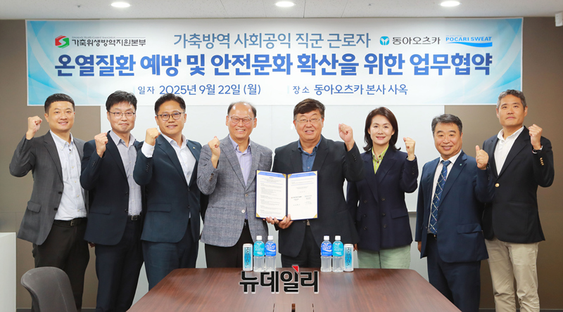 김태환(왼쪽) 가축위생방역지원본부 본부장과 박철호 동아오츠카 대표이사 사장이 22일 동아오츠카 본사에서 '가축방역사회공익직군 온열질환 예방 및 안전문화 확산'을 위한 업무협약식을 진행하고 있다.양사는 이번 협약으로 △폭염 대비 온열질환 예방 교육 및 트레이닝 △온열질환 예방 캠페인 및 홍보 활동 △안전문화 확산을 위한 공동 프로그램 운영 △예방을 위한 음료 및 지원 물품 후원·공급 등 다양한 협력 사업을 추진한다.