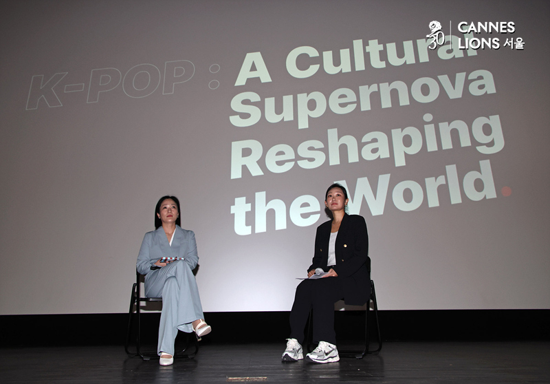 김지은 한국펩시콜라 마케팅 상무와 차윤정 퍼블리시스그룹 코리아 디렉터가 24일 서울 종로구 광화문 씨네큐브에서 개막한 2025 칸라이언즈서울에서 '소비자를 움직이는 K-POP 과 브랜드의 만남'를 주제로 강연하고 있다.2025 칸라이언즈서울은 기업 마케터, 홍보, 크리에이티브 디렉터, 미디어 종사자, 관련학과 학생 등 현업 광고 마케팅 전문가들과 예비 크리에이터들이 그해 칸라이언즈의 주요 토크와 수상작 등 글로벌 크리에이티비티 산업의 트렌드를 공유하고 토론하는 국내 최고, 최대의 크리에이티비티 축제다.2025 칸라이언즈서울은 9월 24일부터 26일까지 광화문 씨네큐브에서 열린다.