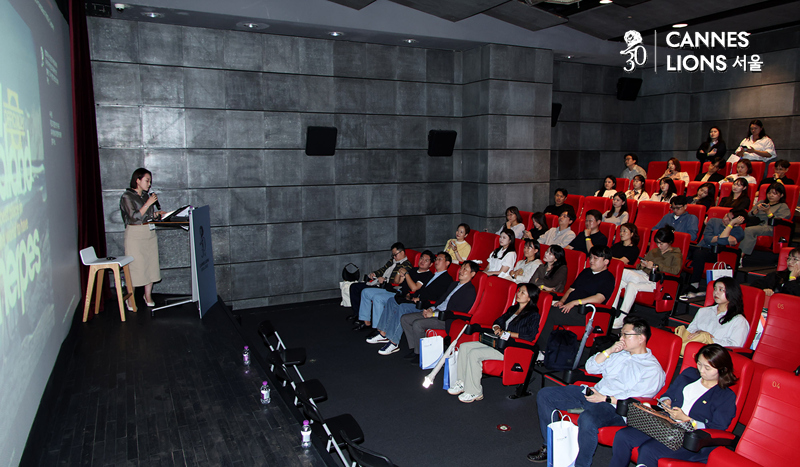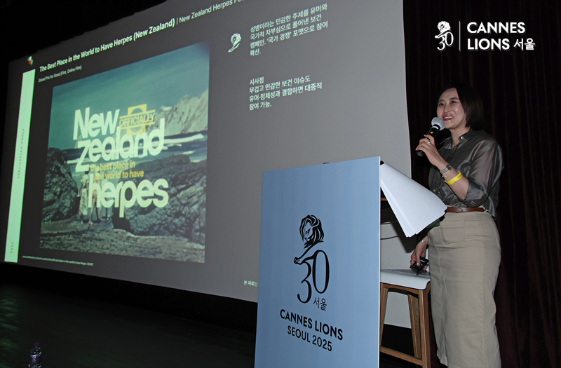 강지현 서비스플랜코리아 대표가 24일 서울 종로구 광화문 씨네큐브에서 개막한 2025 칸라이언즈서울에서 정부광고 특별 세미나에서 강연하고 있다.2025 칸라이언즈서울은 기업 마케터, 홍보, 크리에이티브 디렉터, 미디어 종사자, 관련학과 학생 등 현업 광고 마케팅 전문가들과 예비 크리에이터들이 그해 칸라이언즈의 주요 토크와 수상작 등 글로벌 크리에이티비티 산업의 트렌드를 공유하고 토론하는 국내 최고, 최대의 크리에이티비티 축제다.2025 칸라이언즈서울은 9월 24일부터 26일까지 광화문 씨네큐브에서 열린다.