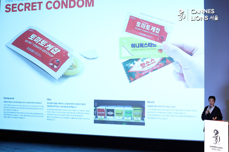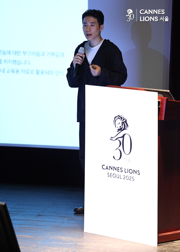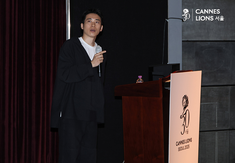 이승재 아이디엇 대표가 24일 서울 종로구 광화문 씨네큐브에서 '광고제를 현업으로, 솔버타이징 노하우'를 주제로 강연하고 있다. 이 대표는 2025 칸라이언즈 아웃도어, 스파이크아시아 심사위원을 역임했다.
