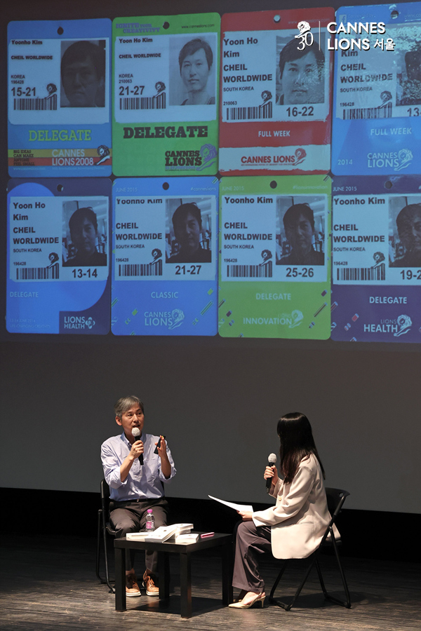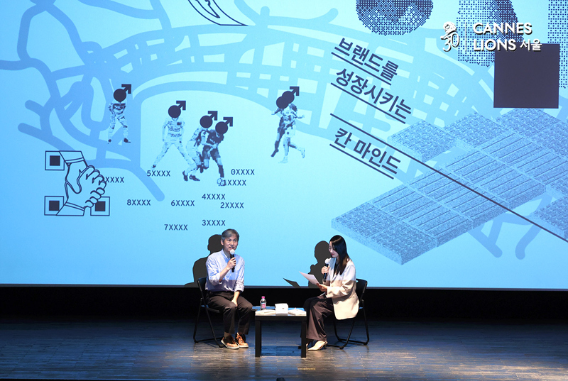 김윤호 제일기획 프로가 24일 서울 종로구 광화문 씨네큐브에서 '브랜드를 성장시키는 칸마인드'를 주제로 김수경 브랜드브리프 기자와 대담을 나누고 있다.