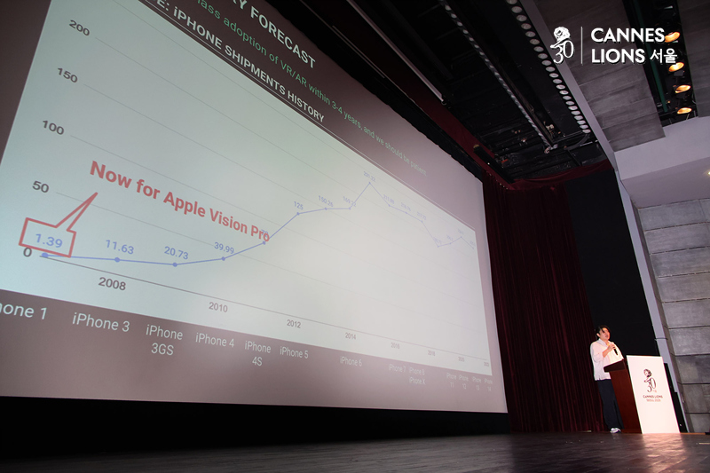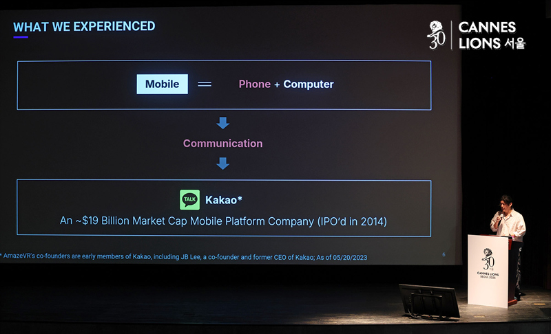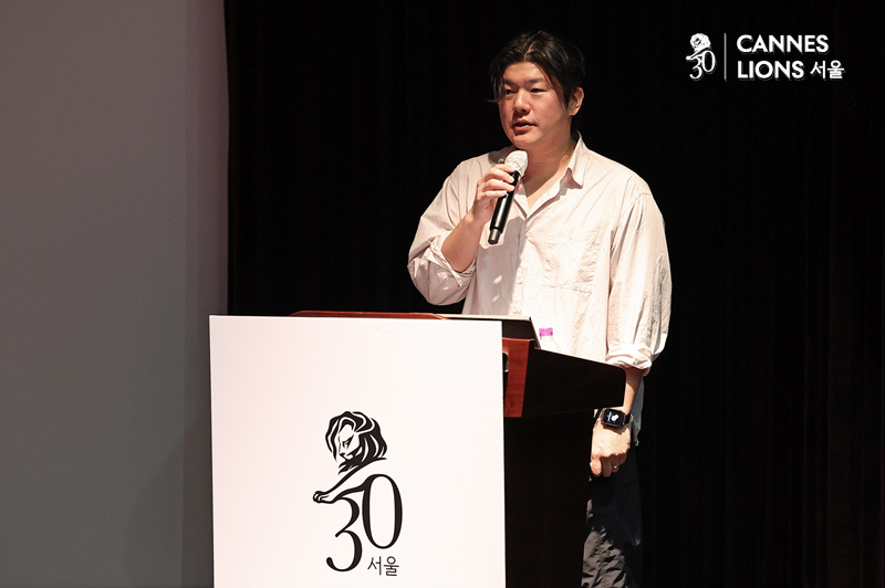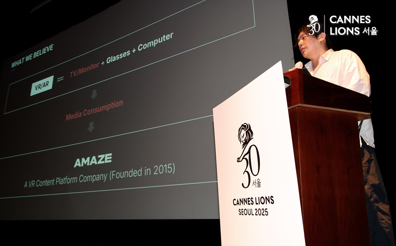 이승준 AMAZE CEO가 26일 서울 종로구 광화문 씨네큐브에서 진행되는 2025 칸라이언즈서울에서 'AI와 언리얼 엔진을 활용한 VR 콘서트 제작 프로세스를 통해 보는 XR의 미래'를 주제로 강연하고 있다.