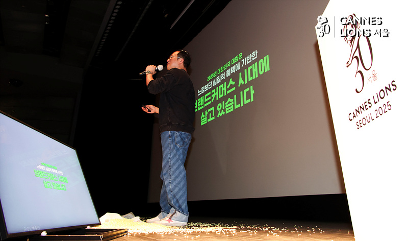 박준석 하나은행 팀장이 26일 서울 종로구 광화문 씨네큐브에서 진행되는 2025 칸라이언즈서울에서 '머니드림 광고캠페인 3년의 힘을 찾아서'을 주제로 강연하고 있다.