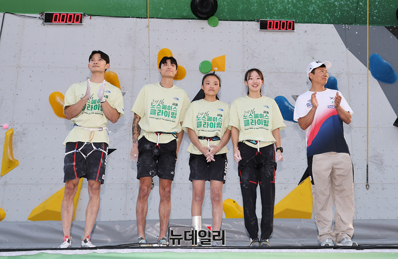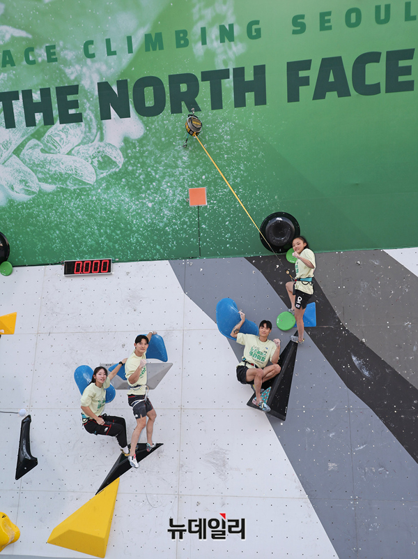 노스페이스 애슬리트팀 소속 선수이자 스포츠클라이밍 국가대표 서채현, 정지민, 신은철, 천종원 선수가 27일 서울 송파구 올림픽공원 한얼광장에서 열린 '제29회 노스페이스컵 전국 스포츠클라이밍 대회'에서 시범 경기를 앞두고 인사를 하고 있다.