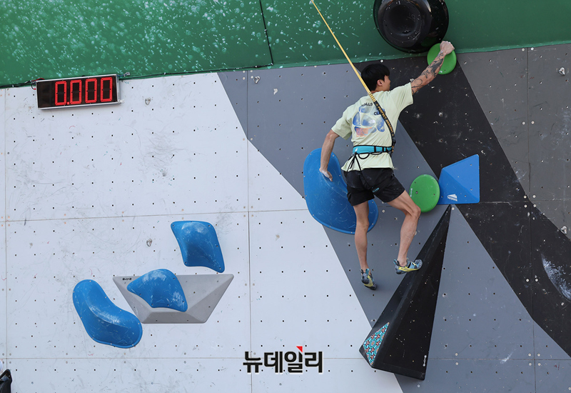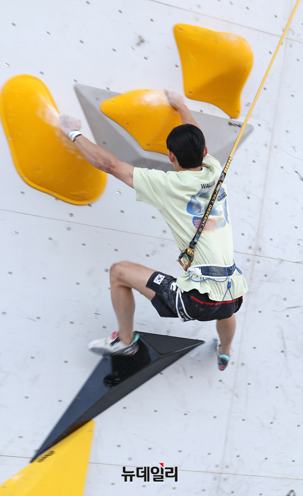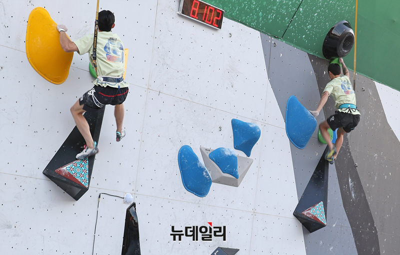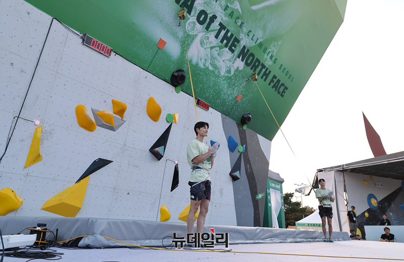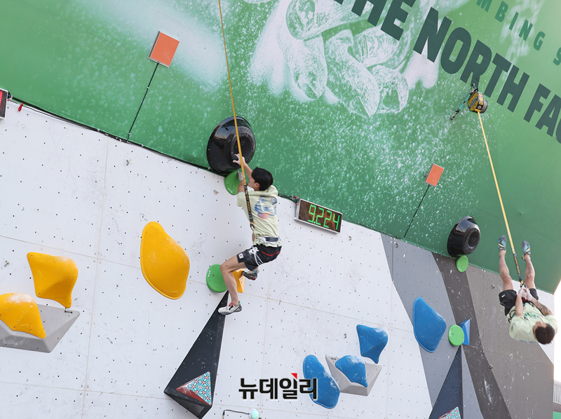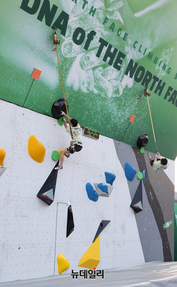 노스페이스 애슬리트팀 소속 선수이자 스포츠클라이밍 국가대표 신은철, 천종원 선수가 27일 서울 송파구 올림픽공원 한얼광장에서 열린 '제29회 노스페이스컵 전국 스포츠클라이밍 대회'에서 시범 경기를 선보이고 있다.