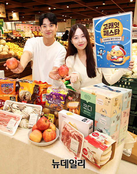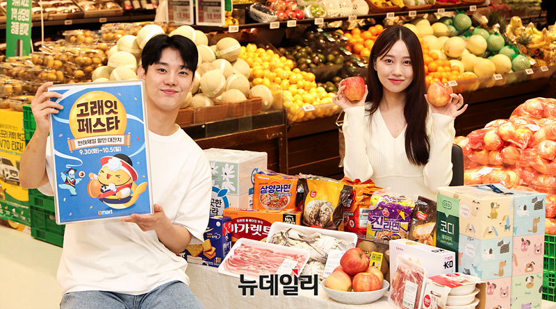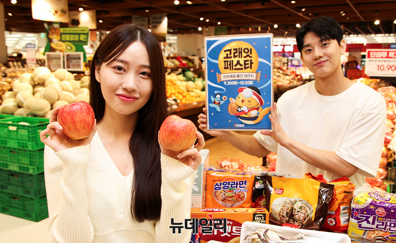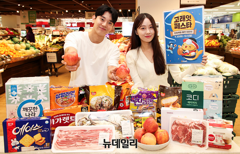 이마트는 삼겹살/사과/감귤/꽃게/킹크랩/꽃갈비 등 추석 인기상품을 초특가에 선보인다. 30일부터 1일까지 가을 햇 보조개 사과(4-8입)를 6,980원에 판매한다. 해당기간 국내산 삼겹살/목심을 행사카드 전액 결제시 50% 할인한 100g 1,740원에, 가을 햇꽃게와 국산 데친문어를 신세계포인트 적립시 50% 할인한 100g 890원/2,890원에 판매한다.