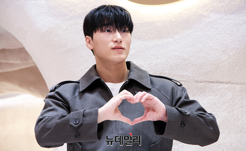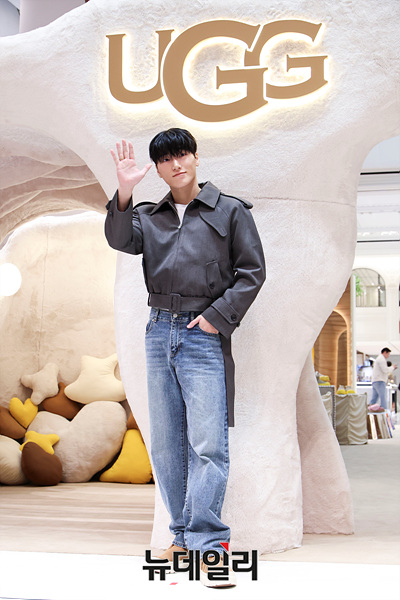 에이티즈 산이 1일 오전 서울 서초구 신세계백화점 강남점에서 열린 글로벌 라이프스타일 브랜드 어그(UGG) 팝업스토어 오픈 기념 포토월에서 포즈를 취하고 있다.