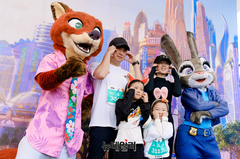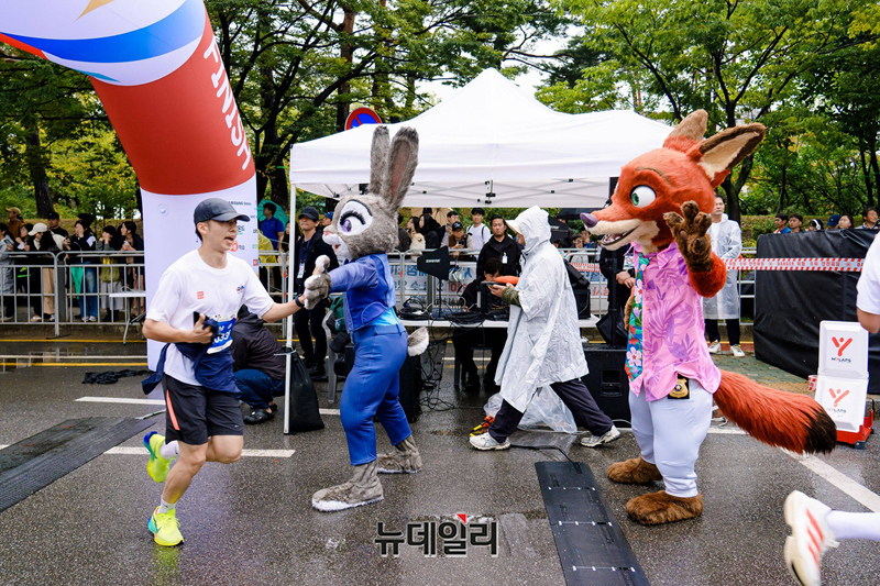'디즈니런 서울 2025' 행사가 11일 서울 여의도공원에서 개최된 가운데 미키와 친구들과 주토피아 캐릭터로 디자인 된 공식 티셔츠를 착용한 참가자들이 빗속에서 서강대교를 달리고 있다. '미키와 친구들' 테마로 구성된 10km 코스는 여의도공원에서 출발해 국회의사당과 서강대교를 거쳐 돌아오는 도심 러닝 코스로 마련됐다. (사진=디즈니코리아)