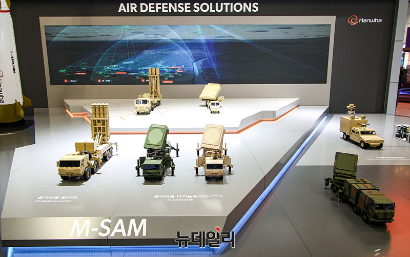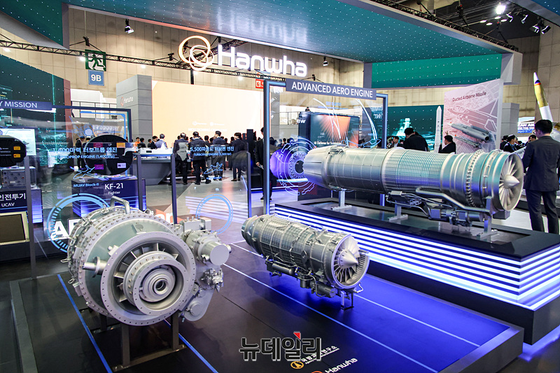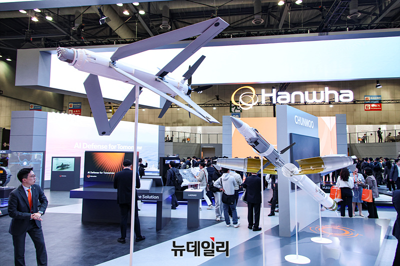 한화그룹 한화에어로스페이스, 한화시스템, 한화오션, 쎄트렉아이가 20일 오전 경기 고양시 일산 킨텍스 제2전시장에서 열린 2025 서울 국제 항공우주 및 방위산업 전시회에서 첨단 장비를 선보이고 있다. (경기 고양=서성진 기자)