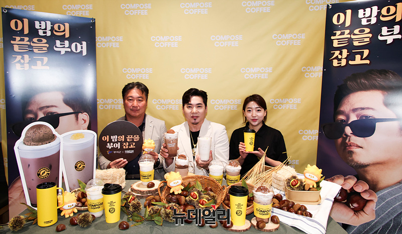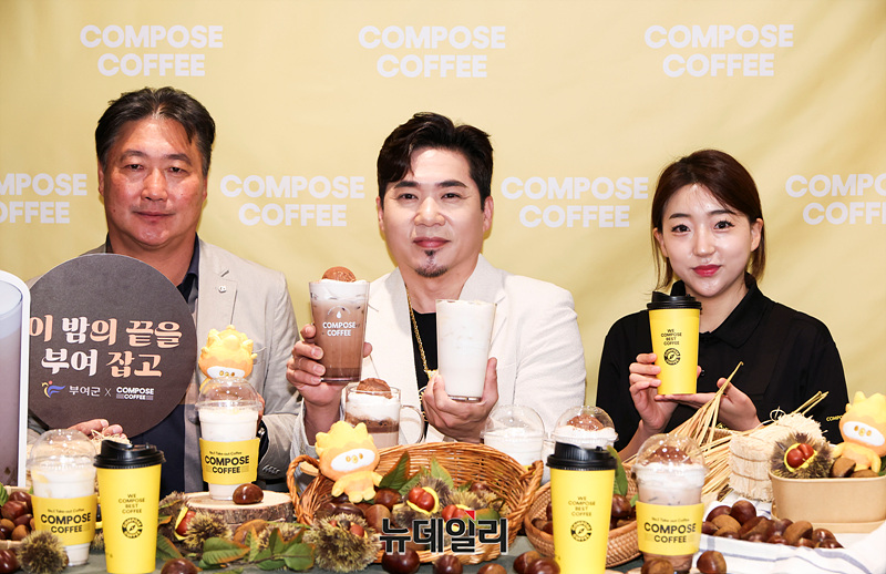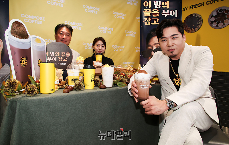 국내 커피 프랜차이즈 브랜드 컴포즈커피와 가수 김조한이 27일 오전 서울 종로구 종로6가점에서 부여 밤을 활용한 신메뉴를 선보이고 있다.