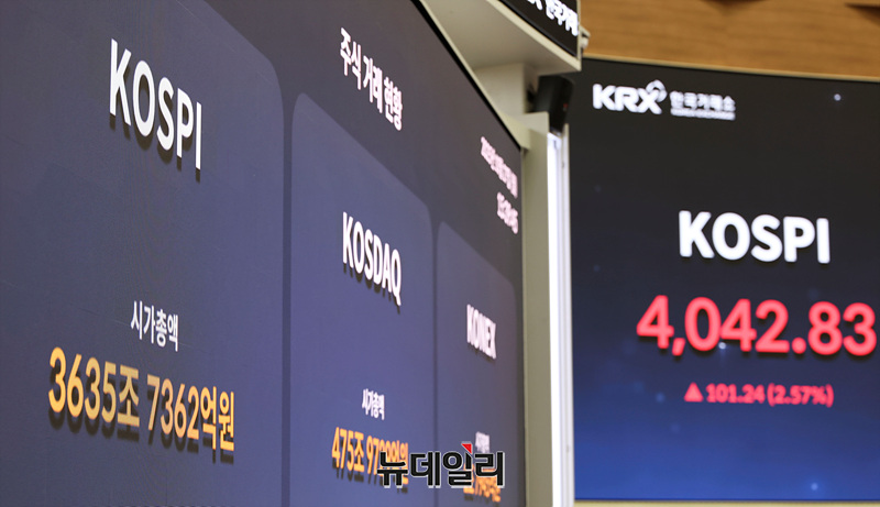 코스피가 사상 처음 장중 4000을 돌파한 27일 오후 서울 여의도 한국거래소 홍보관에 코스피와 삼성전자, SK하이닉스 지수가 표시돼 있다.